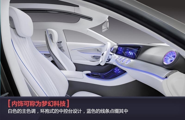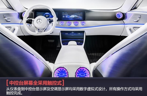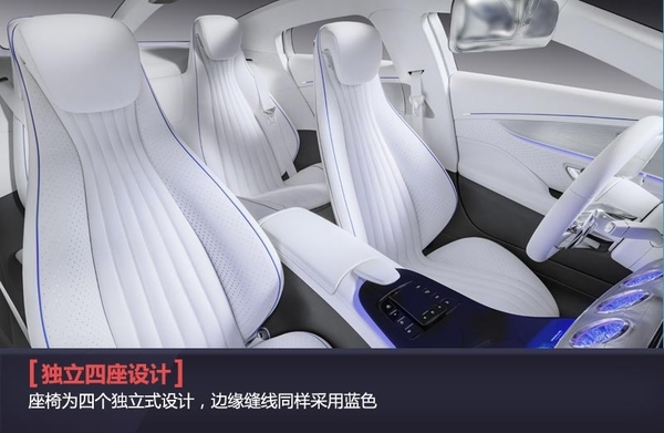 如果说奔驰全新IAA概念车的外观是实用科技,那么内饰方面则可以称为梦幻科技。白色的主色调,环抱式的中控台设计,蓝色的线条点缀其中。座椅为四个独立式设计,边缘缝线同样采用蓝色。从仪表盘到中控台显示屏及空调显示屏均采用数字虚拟式设计。所有操作方式均采用触控完成。空调出风口的设计也极具特色,酷似战斗机尾部喷射管的造型,配以蓝色及粉色的氛围灯进行装饰。白色加蓝色的内饰主色调,寓意着奔驰对蓝天白云的追求,以及对环境保护的努力。