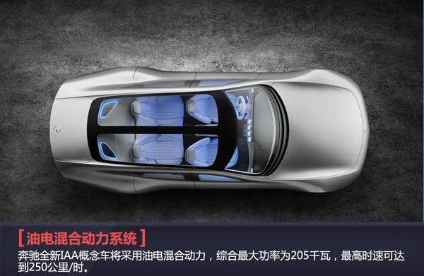 在动力方面,奔驰全新IAA概念车将采用油电混合动力,综合最大功率为205千瓦,最高时速可达到250公里/时。在空气动力学模式下,纯电动行驶里程为66公里,CO2排放量可以控制在28克/百公里。在原始设计模式下,其行驶里程为62公里,CO2排放量可以控制在31克/百公里。