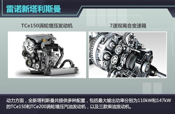动力方面,全新塔利斯曼共提供多种配置,包括最大输出功率分别为110kW和147kW的TCe150和TCe200涡轮增压汽油发动机,以及三款柴油发动机。TCe200和dCi130匹配6速手动或EDC双离合变速箱,而dCi160匹配6速双离合变速箱。