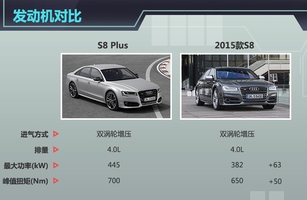 动力方面,新车将搭载4.0升双涡轮增压发动机,在对排气阀门及涡轮内部结构进行调校后,最大输出功率可达445kW,比S8标准版高出了63kW,峰值扭矩为700Nm,比S8标准版高出了50Nm。新车百公里加速用时3.8s,极速为250km/h,选装提速套件后极速可提高至305km/h。