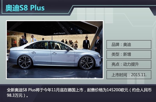 全新奥迪S8 Plus将于今年11月底在德国上市,起售价格为145200欧元(约合人民币98.3万元)。凭借奥迪的最新技术和大幅提升的动力,相信S8 Plus在上市后能获得不少高端用户的青睐。(网通社2015年9月17日北京报道)