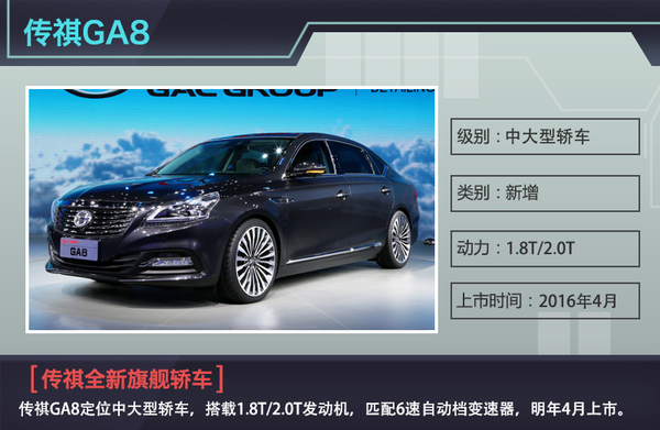 GA8定位中大型轿车。广汽集团执行董事、广汽乘用车董事总经理吴松在接受网通社采访时表示:“全新的旗舰轿车GA8代表传祺最高制作水平,我估计这也将是中国中大型轿车的最高水平。”自品牌发展至今,广汽传祺在轿车领域一直缺乏豪华轿车,未来GA8的上市将彻底填补这一空白,完善广汽传祺轿车产品阵容。新车将搭载传祺自主研发的1.8T和2.0T两款发动机,匹配6速自动档变速器。其中2.0T发动机扭矩将达到300N.m,性能超过目前市面上大部分2.0T发动机。