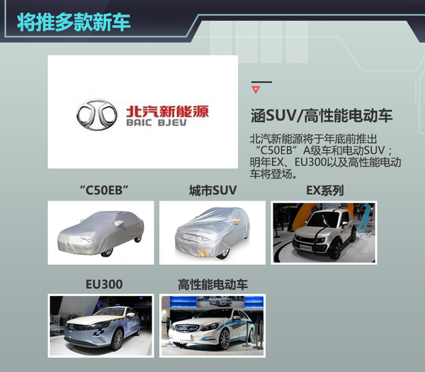 据了解,北汽新能源将于今年年底前推出代号为“C50EB”的全新A级车和首款电动SUV车型;而到2016年,包括EX系列、EU300以及北汽新能源与Atieva联合开展的高性能电动汽车也将悉数登场亮相。可以预见的是,未来北汽新能源旗下或将覆盖轿车、SUV和MPV三个细分领域,车型级别可以从A0级扩展至C级。