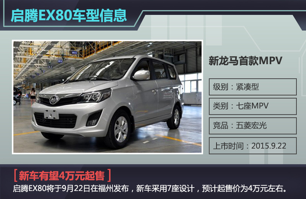 自2014年推出首款微客M70后,福汽启腾便开始规划向具有更大市场前景的传统乘用车领域发展。日前,网通社从福汽新龙马官方获悉,旗下首款MPV“启腾EX80”将于今日正式上市,新车采用七座布局,预计起售价为4万元左右。