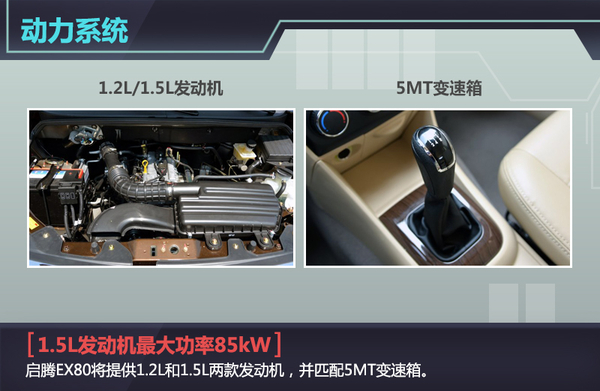 动力方面,启腾EX80将提供1.2L和1.5L DVVT两款发动机,后者的最大功率为85kW,最大扭矩150N·m,百公里综合油耗6.8L。传动系统部分,该车将配备5速手动变速箱。此外,启腾EX80底盘采用了前麦弗逊后五连杆式的悬架结构。