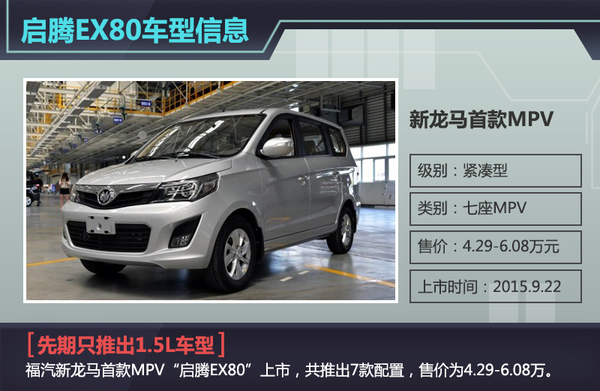 自2014年推出首款微客M70后,福汽启腾便开始规划向具有更大市场前景的传统乘用车领域发展。日前,网通社从福汽新龙马官方获悉,旗下首款七座MPV“启腾EX80”正式上市,新车共推出7款1.5L配置车型,售价区间为4.29-6.08万元。
