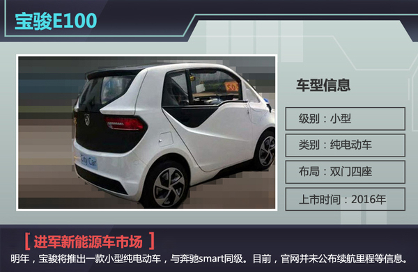 目前宝骏旗下并没有新能源车型投放市场,不过对于新能源这个新兴领域宝骏已经做好规划。上汽通用五菱公共关系经理周钘向网通社透露了宝骏2016年新车规划:明年宝骏品牌将至少推出4款新车,其中包括一款纯电动车。据了解,新车命名E100,是宝骏旗下首款新能源车型。该车造型十分小巧酷似奔驰smart,是一款小型双门四座纯电动车,尾部G型的尾灯让这款车看上去科技感十足。据悉,新能源基地建成后,E100将率先在此投产并于明年上市,而未来,将有更多新能源车型也将在此投产。