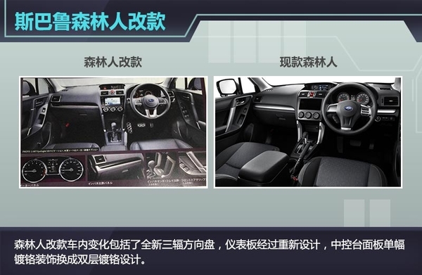 森林人改款车内变化包括了全新三辐方向盘,仪表板经过重新设计,中控台面板单幅镀铬装饰换成双层镀铬设计。