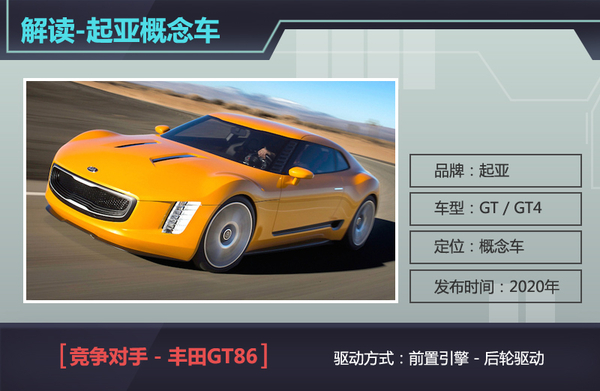 起亚全新GT跑车在车身外观方面将采用柠檬黄作为主要涂装色调,与此同时还采用了低重心的设计语言,从而保证较强的操控特性,最终将竞争对手瞄准为丰田旗下的轻量化跑车GT86。