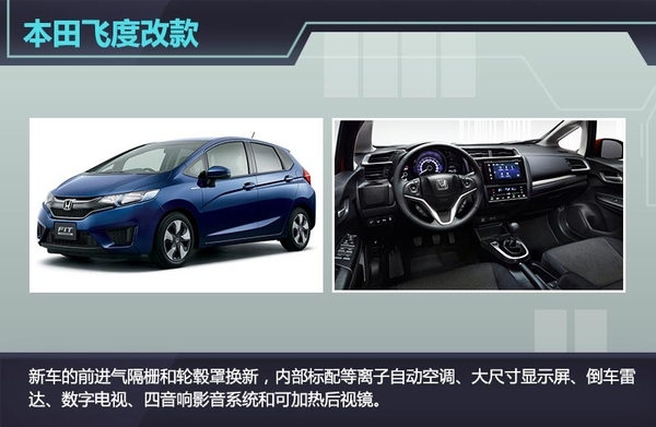 2016改款飞度基本上保持了现款车型的设计风格,仅对细节处进行小幅改动。新车的前进气隔栅和轮毂罩换新,内部标配等离子自动空调、大尺寸显示屏、倒车雷达、数字电视、四音响影音系统和可加热后视镜。