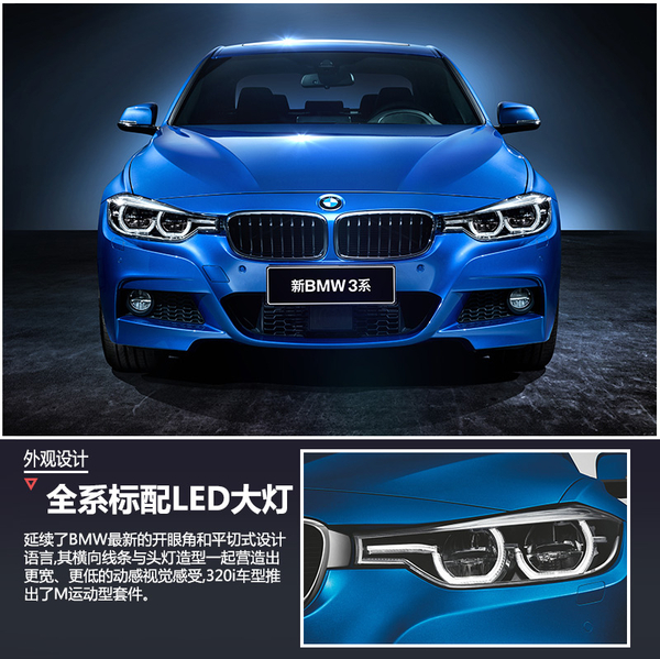 宝马新3系的头灯造型,延续了BMW最新的开眼角和平切式设计语言;前保险杠的设计更有立体感和力量感,其横向线条与头灯造型一起营造出更宽、更低的动感视觉感受。在这次3系中期改款车型上,为了更加凸显3系标准轴距版的运动特质,320i车型推出了M运动型套件,同时328i的所有车型更是标配了M运动套件。不但外观上具备了更加复杂多变的造型设计,座舱内的M运动性方向盘与运动型座椅同样极具动感气息。