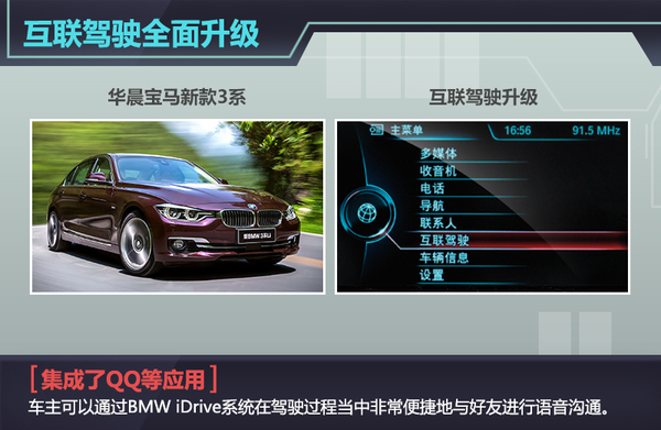 2013年,BMW 3系成为同级最先配备互联科技的车型,而在那个时代车联网还是一个很陌生的词汇。伴随着互联网的快速发展,当车联网已经成为必备品的今天,3系的互联科技全面升级。其中集成了大家所熟知的QQ,车主可以通过BMW iDrive系统在驾驶过程当中非常便捷地与好友进行语音沟通,并分享位置和地址,同时,车主还可以通过社交互联应用了解周围的生活和娱乐信息。