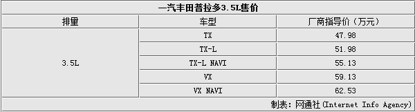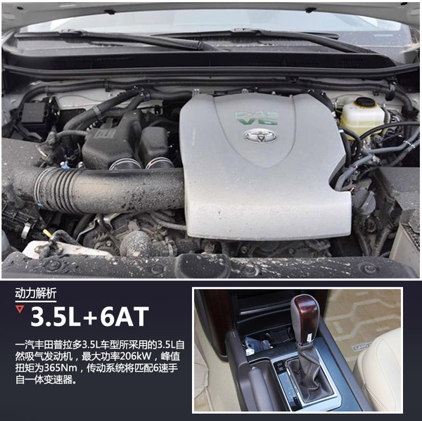 一汽丰田普拉多3.5L车型在动力上搭载3.5L V6自然吸气发动机,最大功率206kW,峰值扭矩为365Nm,匹配6速手自一体变速器。该车的面市将满足不同消费者的需求。普拉多2.7L车型百公里综合油耗为11.4L,该车整备质量为2060kg,普拉多3.5L车型整备质量为2095kg,相比2.7L车型增加35kg,并且该车排量更大,但是百公里综合油耗与2.7L车型同样为11.4L,这样的表现确实让人眼前一亮,一款动力更强却又更省油的车是当下消费者期待的。