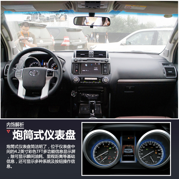 普拉多3.5L车型在内饰方面配备三区域独立温度控制系统;双圆盘式仪表盘简洁明了,可获得时速、发动机转速、温度等信息;采用4.2英寸彩色TFT多功能信息显示屏,除可显示瞬间油耗、里程等基础信息,还可显示多种系统及按钮操作信息,如多地形可选驾驶辅助设计、前轮转向角度、车身倾斜角度等,更具可读性和实用性。