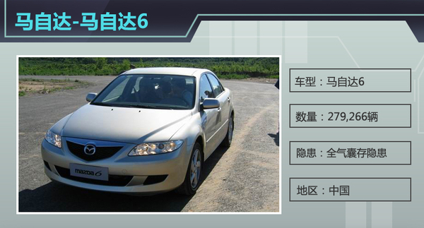 根据质检总局公布的消息,此次涉及召回车型为老款马自达6轿车。其生产日期区间为2003年3月29日至2008年12月29日,共涉及279,266辆车。