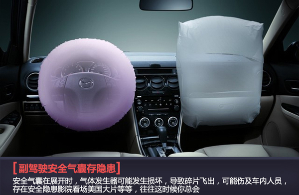 据了解,此次召回马自达6轿车原因是安全气囊存隐患。由于供应商原因,安全气囊在展开时,气体发生器可能发生损坏,导致碎片飞出,可能伤及车内人员,存在安全隐患。