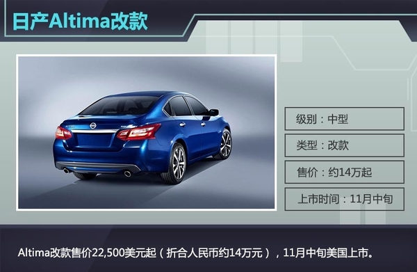 作为美国市场日产最佳销量车型Altima(美版天籁)日前推出了改款车型,且其官图正式发布,新车将于11月中旬美国上市,且其售价也曝光,网通社从美国汽车媒体Autonews获悉,包含运费Altima改款售价22,500美元起(折合人民币约14万元),这样的售价与其竞争对手雅阁改款售价相当。