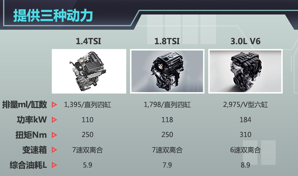 在动力方面,上海大众新款帕萨特将提供三种动力选择,分别是EA211系列的1.4TSI发动机匹配7速DSG双离合变速箱、第二代EA888系列1.8TSI发动机匹配7速DSG双离合变速箱以及3.0升V6自然吸气发动机匹配6速DSG双离合变速箱。其中值得注意的是,EA211系列的1.4TSI发动机采用的是高功率版本,最大功率110千瓦、峰值扭矩250牛米。