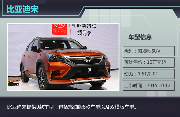 近年来,比亚迪在新能源汽车领域表现优异,旗下新能源产品阵容覆盖愈加全面。在相继推出比亚迪秦和比亚迪唐两款插电式混合动力车型后,企业又针对更细分的SUV市场展开部署。日前,网通社从比亚迪汽车官方获悉,比亚迪新紧凑SUV——比亚迪宋今日上市,新车提供8款燃油版车型与一款双模版车型,预计起售价格为10万元左右。