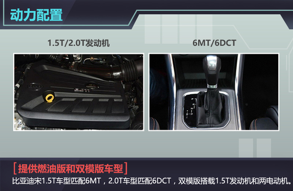 动力方面,比亚迪宋燃油版搭载1.5T和2.0T两款发动机,其中1.5T发动机最大输出功率为113kW,峰值扭矩为240N.m,传动系统匹配6速手动变速箱;2.0T发动机最大输出功率为151kW,峰值扭矩为320N.m,传动系统匹配6速双离合变速箱。宋双模混动版车型搭载由1.5T发动机和两台电动机组成的混合系统,通过后轮电动机实现全时电四驱的驱动形式。根据官方发布的信息,比亚迪宋0-100km/h加速时间为4.9秒,最高车速达到180km/h,纯电动模式下续航里程为70km,百公里油耗为2L。