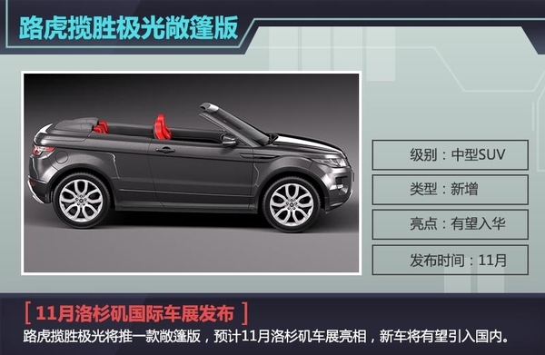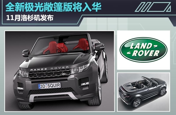 路虎揽胜极光自推出以来以其极具鲜明的车顶“后倾式”设计而为大众所熟悉,日前,网通社从车迷世界Worldcarfans获悉,路虎揽胜极光将推一款敞篷版,作为一款中型敞篷版SUV,它的推出绝对会带给大众惊喜,新车预计将于11月洛杉矶国际车展正式亮相,新车将有望引入国内,竞争对手瞄准奥迪Q5。