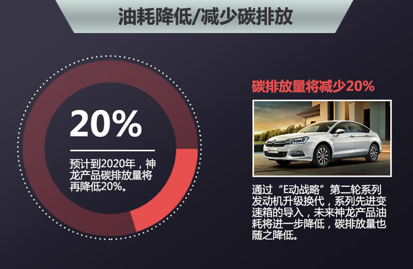 在完成现有“T+STT”动力战略的基础上,神龙旗下东风标致与东风雪铁龙车型平均油耗已全面降低。而随着未来“E动战略”的第二轮系列发动机的升级换代,更多全新变速箱的导入以及新能源计划的推进,预计到2020年,神龙公司所有产品碳排放量将再降低20%。