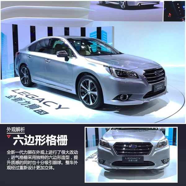 从外观上来看,新一代力狮在细节部分做了很大改动;沿用了斯巴鲁最新的家族式设计理念,犀利的前大灯分布在车头两侧,六边形的大尺寸进气格栅颇有质感,边框加以镀铬材质装饰,格外抢眼,同时提升时尚感;保险杠也经过重新设计,采用开口式设计,使得整车看起来更加稳重大气。此外,全新力狮的尾部造型相比现款视觉效果更加动感。