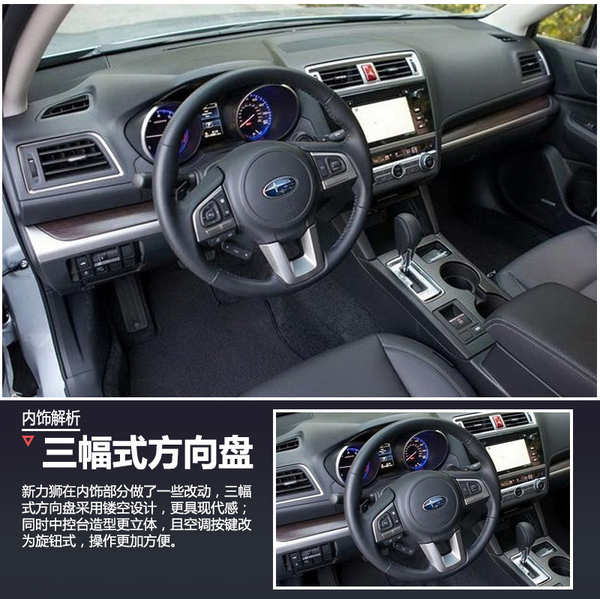 斯巴鲁全新力狮在内饰方面也进行了升级,方向盘采用三幅式镂空设计,配备多功能操作按键,为行车过程中带来便利;中控台采用倒梯形设计,加以木纹饰板装饰,搭配大尺寸液晶显示屏,各功能区布局合理。此外,全新力狮还将新增一键启动、自动空调、坡道辅助、后视摄像头、后方车辆穿越提示、EyeSight系统、盲点监测、变道辅助系统以及主动扭矩矢量控制系统(ATC)等配置,很大程度上提升了新车的安全性。