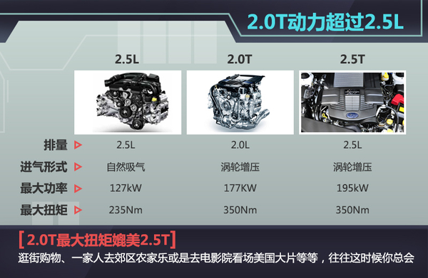 动力方面,全新一代力狮搭载了2.0T引擎,最大功率177kW,最大扭矩则达到350Nm,通过与斯巴鲁现款力狮的2.5L自然吸气和2.5T增压发动机进行动力对比可知,斯巴鲁2.0T发动机动力输出介于斯巴鲁目前的2.5L和2.5T两款发动机之间,但峰值扭矩却与目前的2.5T相持平。相比现款车型搭载的2.5L自然吸气发动机动力得到大幅提升。