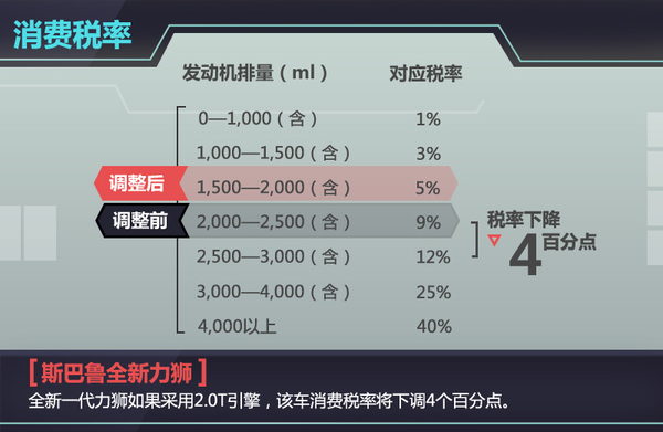 在换装更小排量的2.0T引擎之后对应税率仅为5%,下调了4个百分点。以目前该车顶配车型36.98万的售价计算,消费税率若下降4个百分点相当于1.5万元左右。对于一款中级车来说这部分成本还是很可观的,无论对于厂商扩大市场份额还是消费者降低购车成本均是一个利好消息。