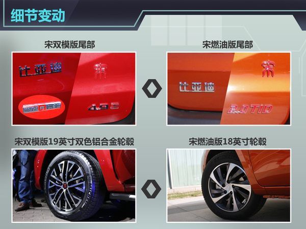 外观方面,比亚迪宋双模版基本与燃油版保持一致。前脸呈现出X型,同时这部分是采用磨砂塑料材质,X型的下方两侧在雾灯位置形成了上卷的造型,带有中国传统文化中“祥云”的特点。车身侧面的线条流畅,异色涂装从大角度的A柱开始一直延伸到车尾的扰流板,结合上扬的双腰线和车顶行李架设计,整体造型十分出彩。不同的是,双模版车型采用19英寸双色铝合金轮毂,更为动感时尚,车尾加入了极速电四驱和4.9S的标识清楚让人分辨出与燃油版车型的不同之处。
