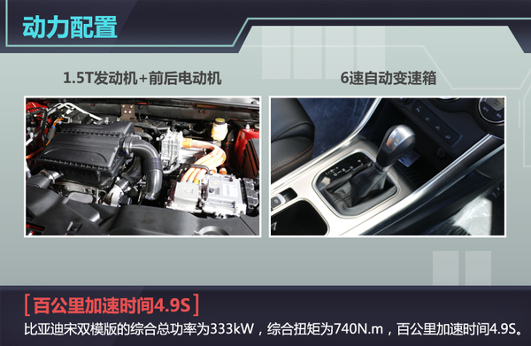 比亚迪宋双模版并没有沿用2.0T发动机,而是搭载相对排量更低的1.5T发动机与两台电动机,匹配6速自动变速箱。就发动机参数来讲,比亚迪唐动力的综合总功率为371kW,综合扭矩为820N.m。而比亚迪宋双模版的综合总功率为333kW,综合扭矩为740N.m,虽然动力略低于唐,但是并不影响宋在行驶过程中的动力表现。