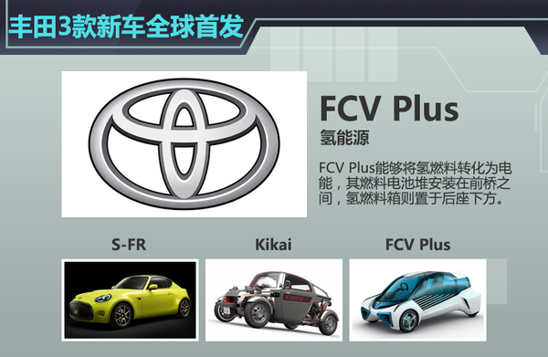 在本月28日开幕的第44届东京车展中,丰田S-FR、FCV PLUS、KIKAI将全球首发亮相。其中FCV PLUS为新能源车。FCV Plus是一款能够将氢燃料转化为电能并加以利用的新能源车,该车的燃料电池堆安装在前桥之间,氢燃料箱则置于后座下方,另外丰田还为该车的每个车轮配备了一台独立的轮毂电机,此举也有利于提升座舱空间利用率。