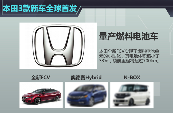 在此次东京车展上,本田旗下全新FCV、奥德赛Hybrid和N-BOX共三款新车将全球首发亮相,其中全新FCV和奥德赛Hybrid均为新能源车。据了解,本田全新FCV车身造型延续了FCV概念车的设计,相比概念车型,量产版的设计更加稳重。新车采用燃料电池技术,与2008年发布的FCV“FCX CLARITY”相比,实现了燃料电池单元的小型化,其厚度减小了20%,数量减少30%,体积缩小了33%,续航里程将超过700km。新车预计于2016年3月在日本上市。据悉,全新FCV只是该车暂时的称呼,正式名称要等到新车发布后才会揭晓。
