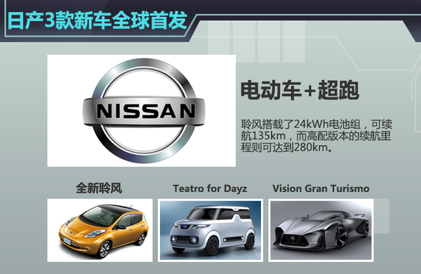 日产在此次东京车展上也将发布全新聆风、TEATRO for DAYZ概念车和2020 VISION GRAN TURISMO概念车,前两款均为新能源车。全新纯电动车型——聆风和上代车型外观差异不大,较为明显的是轮毂造型的改变。而新车在续航里程上的升级更加引人注目。全新聆风有两种续航里程版本车型供选择,其中一款搭载了现款车型的24kWh电池组,可续航135km,而高配版本将会使用高容量电池组,续航里程达到280km。这主要是通过改善风阻系数、提高车载电器设备效率以及电池效率等多种手段达成的。在快充模式下,全新聆风一次充电可以在4小时内完成,在普通充电模式下则需要8小时。
