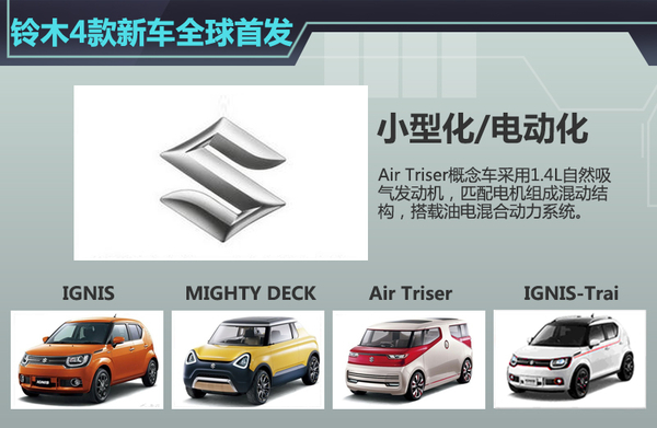 铃木有4款小型概念车IGNIS、MIGHTY DECK、Air Triser、IGNIS和IGNIS-Trai将在京东车展全球首发,其中MIGHTY DECK和Air Triser均为新能源车。MIGHTY DECK概念车是一款尺寸略大于SMART的微型车,其后备箱采用了类似皮卡的开放式设计,且其中一个座椅可以放倒,储物空间灵活;Air Triser概念车是一款厢式旅行车,在车长不足4.2米的情况下,采用了可自由布局的7座设计。动力方面,两款新车均将使用油电混动系统。