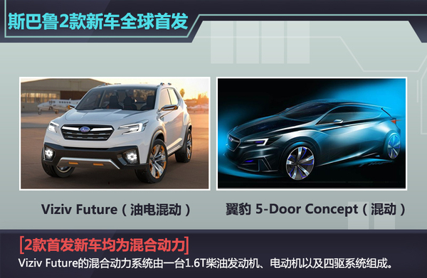 斯巴鲁的两款新车Viziv Future和翼豹5-Door Concept均为混合动力,其中,Viziv Future概念车继承了斯巴鲁Viziv以及Viziv 2概念车的设计,进气格栅两旁便是造型犀利的头灯组。另外,前保险杠两侧还装备有蜂窝状雾灯,显得十分个性。值得一提的是,Viziv Future概念车的后保险杠可以向外伸长,并可以携带两辆自行车。该车搭载了一套混合动力系统,该系统是由一台1.6T柴油发动机、电动机以及四驱系统组成。