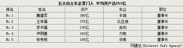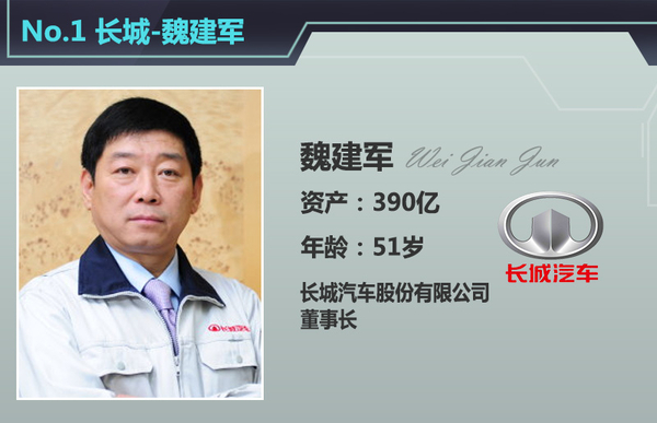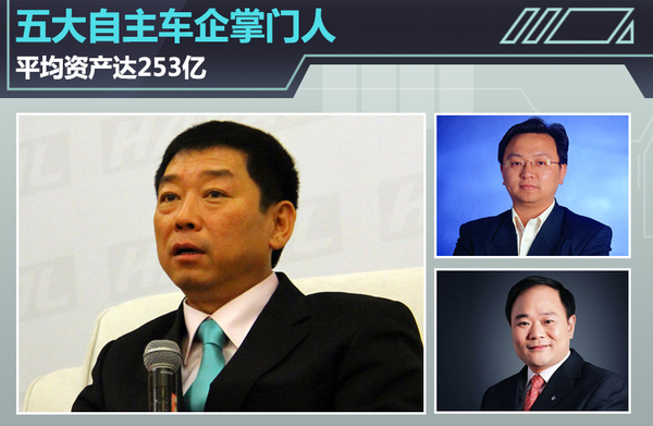 在今年车市增速放缓的大背景下,自主品牌汽车总体表现不仅跑赢大市,而且增幅高于不少合资车企,这些自主车企的掌门人也都赚得盆钵满盈。近日,网通社对自主车企掌门人资产进行梳理后发现,排名前五的车企掌门人分别来自长城、比亚迪、吉利、力帆和华泰,这五人的平均资产达到253亿元,其中长城汽车董事长魏建军坐拥390亿元,排名第一。