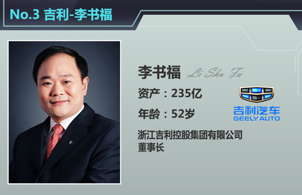 今年前9月,吉利汽车的总销量为355363辆,较去年同期增长约30%,达到了全年销量目标的79%。与此同时,吉利董事长李书福的资产也达到235亿元,位列行业第三。李书福现年52岁,曾白手起家创办吉利集团,使其成为中国第一家生产轿车的民营企业。2010年,吉利汽车以18亿美元的价格收购了沃尔沃100%的股权。此外,李书福还投资成立了北京吉利大学和三亚学院。