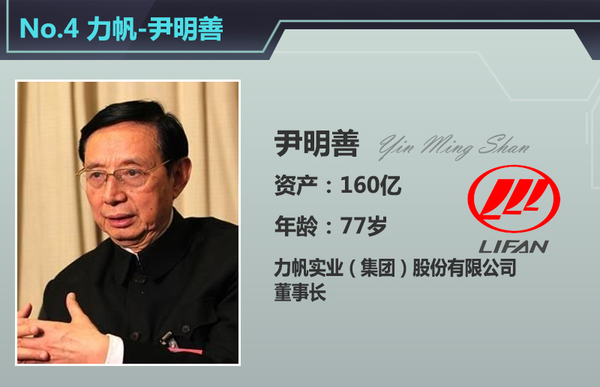 力帆董事长尹明善在54岁时,投资20万创立了“力帆”,如今77岁的他资产已经达到了160亿元。目前,力帆已经成为中国最大的民营企业之一,2014年销售收入达到306.2亿元,在重庆企业100强中位居前十。尹明善及其家族持有重庆力帆集团公司65.68%股份,其本人还持有重庆力帆集团公司第一大股东力帆控股100%股份。时至今日,力帆集团已将自己定位为摩托车和汽车制造企业。