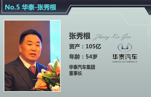华泰董事长张秀根现年54岁,身价105亿元,在本次自主车企掌门人的榜单中排进前五。华泰的前身是1991年成立的“山东荣成汽车改装厂”,为现代在中国组装“战马”越野车(国内名为华泰吉田),年销量只有几千辆。2000年,张秀根从一汽购得华泰,从此成为华泰的董事长。2014年,华泰整体销售收入已经突破520亿元。