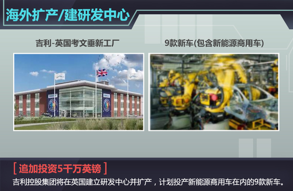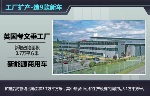 此前吉利已在英国考文垂市的安斯蒂地区斥资2.5亿英镑(约合24.5亿元人民币)建设了一座新工厂,用以生产全新一代伦敦出租车,并销往全球各个市场。据了解,该工厂占地面积85,000平方米,在吉利再度投资5000万英镑后,项目总投资额达到3亿英镑。扩建后的项目将新增用地37,000平方米,其中研发中心和生产设施的面积达到31,000平方米,比原计划扩充了近1倍。