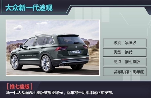 此前大众全新一代途观已正式发布,得益于MQB平台的使用,新车在车内空间和整车重量等方面均有明显提升。最值得一提的是,未来全新途观还将推出7座版车型,并有望与普通版一同在华实现国产。对此大众汽车集团(中国)大众品牌公关与传播总监邓立夫(Ralf Dennissen)向网通社透露:“长轴距的途观将会非常适合那些需要更多内部空间,更多储物空间和更多座位的用户。”目前,国内7座SUV逐渐升温,依托途观在国内积攒的人气和口碑,新一代途观未来的表现值得期待。
