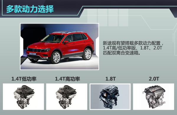 动力方面,全新途观七座版预计将与普通版搭载相同的动力系统。依照中国国情,未来新车国产后,有望提供四款4款汽油发动机,分别为1.4T高低功率版,最大功率分别为92kW和110kW;1.8T发动机最大功率132kW;2.0T发动机,最大功率为162kW。传动部分,新车预计将搭载7速双离合变速箱。