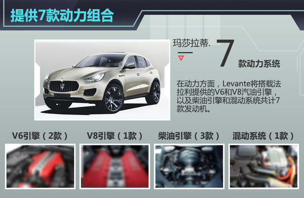 在动力方面,玛莎拉蒂将为首款SUV提供7款动力总成,包括3款汽油引擎、3款柴油引擎以及1款插电混动系统。其中汽油引擎是法拉利提供的V6和V8发动机,最大功率分别为257kW、312kW和412kW;而柴油版车型的最大功率分别为184kW,202kW和250kW。插电混动版车型则随后推出。