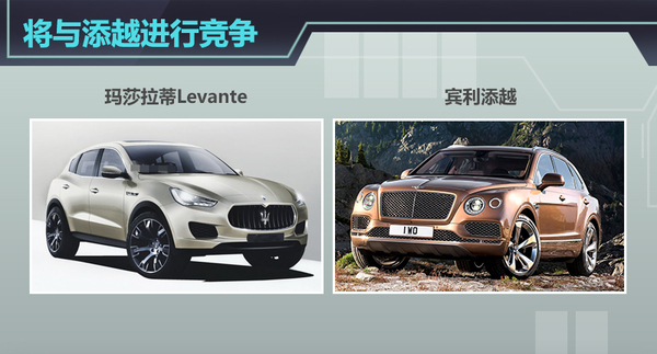 在超豪华领域中,SUV细分市场尚处于发展的起步阶段。此次,玛莎拉蒂首款SUV将目光瞄准同为竞争对手的宾利添越。后者在今年的法兰克福车展首发,并于10月23日在华上市,售价区间为398-480万元。面对顶级豪华SUV这一细分市场的竞争形势,玛莎拉蒂Levante加快推出速度,并有望在售价上低于竞争对手,从而更具市场竞争力。