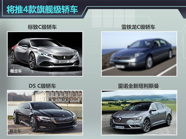 目前,东风标致与东风雪铁龙的旗舰车型为508与C5,定位均为B级轿车。根据神龙公司公布的信息,神龙双品牌未来都将推出级别更高的C级轿车,以进一步丰富产品线,加强竞争力。而DS作为法系豪华品牌的代表,未来也必将推出更高端轿车产品竞争其他豪华品牌。而雷诺方面,全新一代塔利斯曼已经在9月举办法拉克福车展正式亮相,新车将于明年初正式上市。