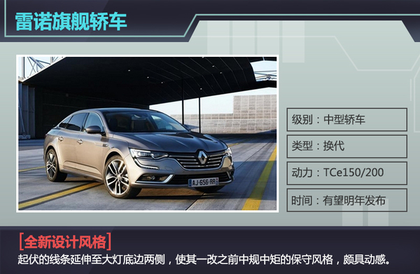 雷诺在不久前闭幕的法兰克福车展正式发布了全新塔利斯曼轿车。全新塔利斯曼在外观方面虽然延续了现款车型的U型格栅设计,但起伏的线条延伸至大灯底边两侧,颇具动感,一改之前中规中矩的保守风格。动力方面,该车将搭载TCe 150和TCe 200两款涡轮增压汽油发动机,传动系统与之匹配的是一台7速双离合变速箱。此外,塔利斯曼还将推出旅行版车型。随着中国市场成为法系车企在全球范围内最重要的海外市场,法系各品牌均将加快对华产品的导入速度,未来将会有更多的新产品引入国内销售。