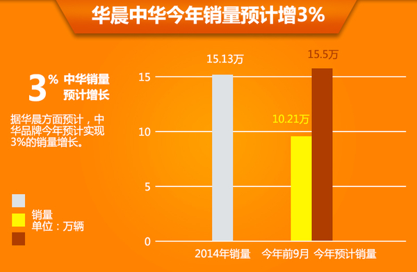 在整体市场表现方面,2014年华晨中华的总销量为15.13万辆,相比2013年的13.44万辆提升了12.5%。数据显示,今年1-9月,华晨中华累计销量达到10.21万辆,同比小幅下滑4.99%。祁玉民表示,中华品牌在四季度的市场表现预计将优于前三季度,整体销量表现同比去年有望实现3%左右的增长。以去年15.13万辆计算,中华品牌今年预计将实现15.5万辆的销量成绩。