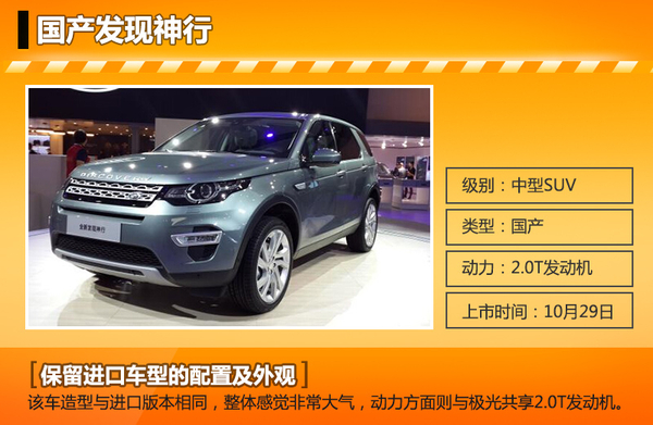 继奇瑞捷豹路虎推出首款路虎品牌国产车型揽胜极光后,在9月份成都车展上首次亮相的第二款国产车型发现神行得到了广泛关注。国产发现神行在外观造型上与进口版本保持一致,并搭载一台2.0T涡轮增压发动机。今日,网通社从奇瑞捷豹路虎汽车官方获悉:路虎第二款国产车型发现神行将于今日正式上市。该车是豪华中型SUV细分领域中,首款采用7座布局的车型,新车预售价40万元起,上市后将与极光形成全新的“组合拳”。
